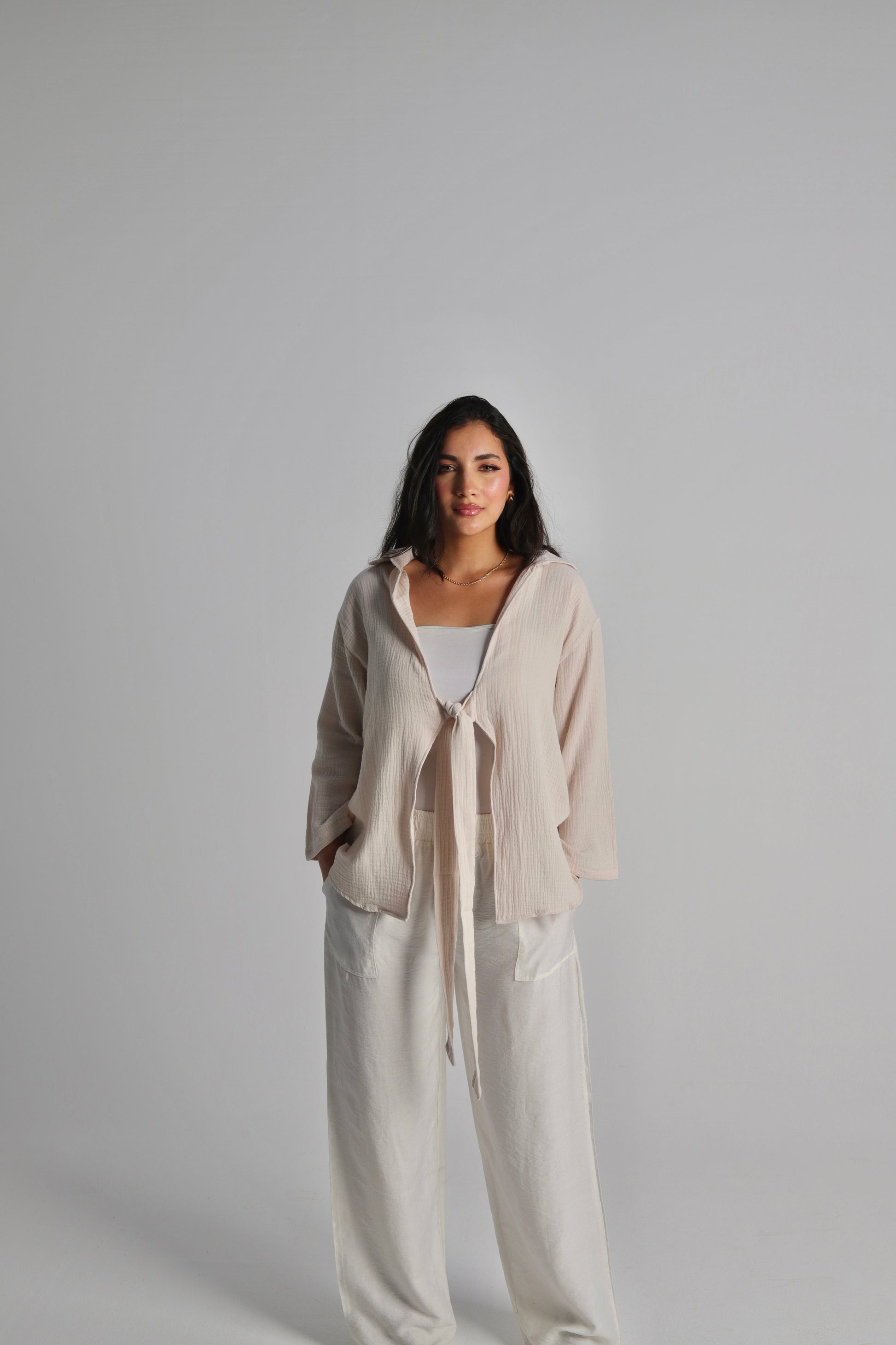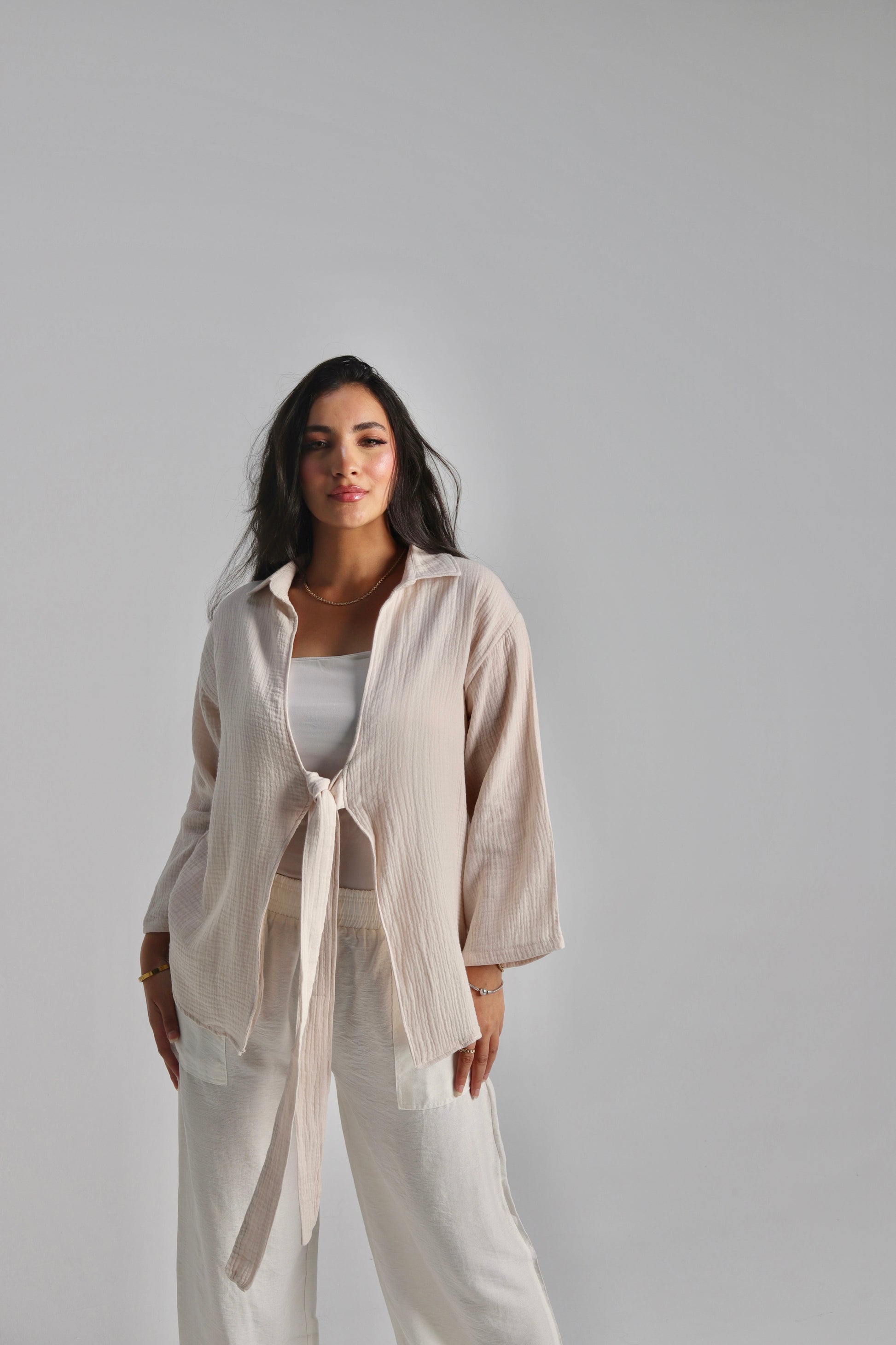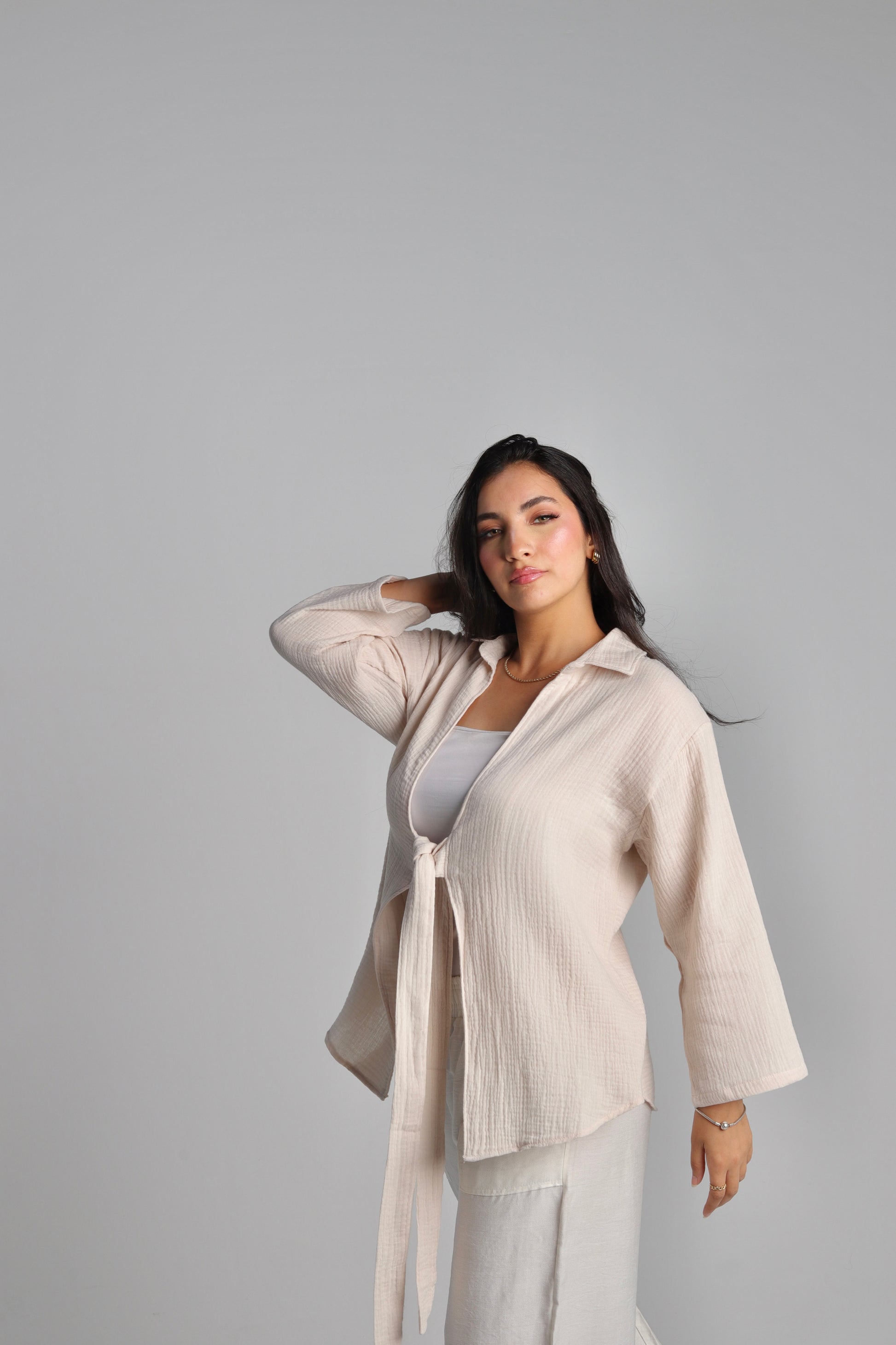 Creamy tie shirt in soft beige Luxury Crinkle fabric with a flattering tie-front and relaxed silhouette for effortless style.