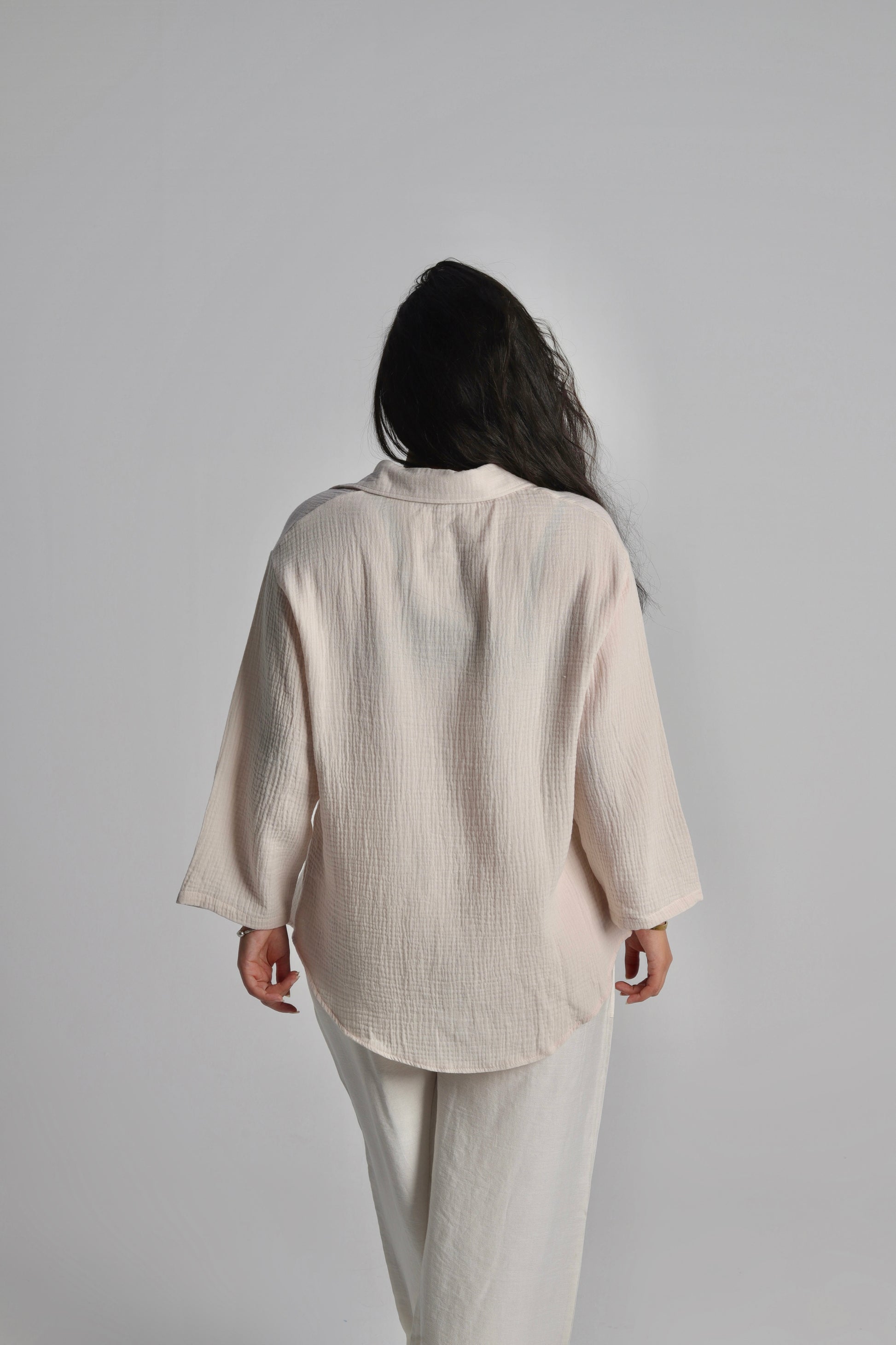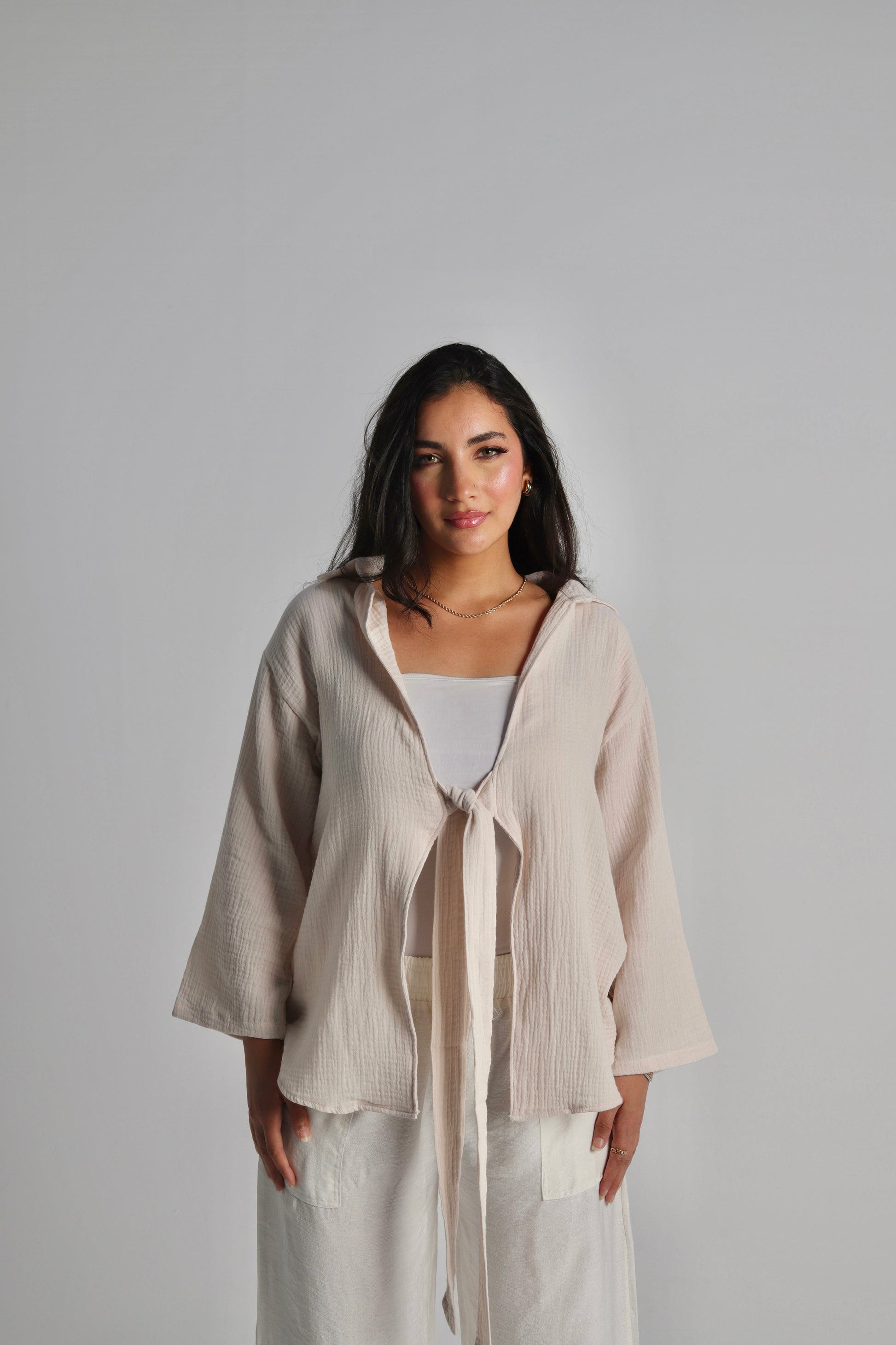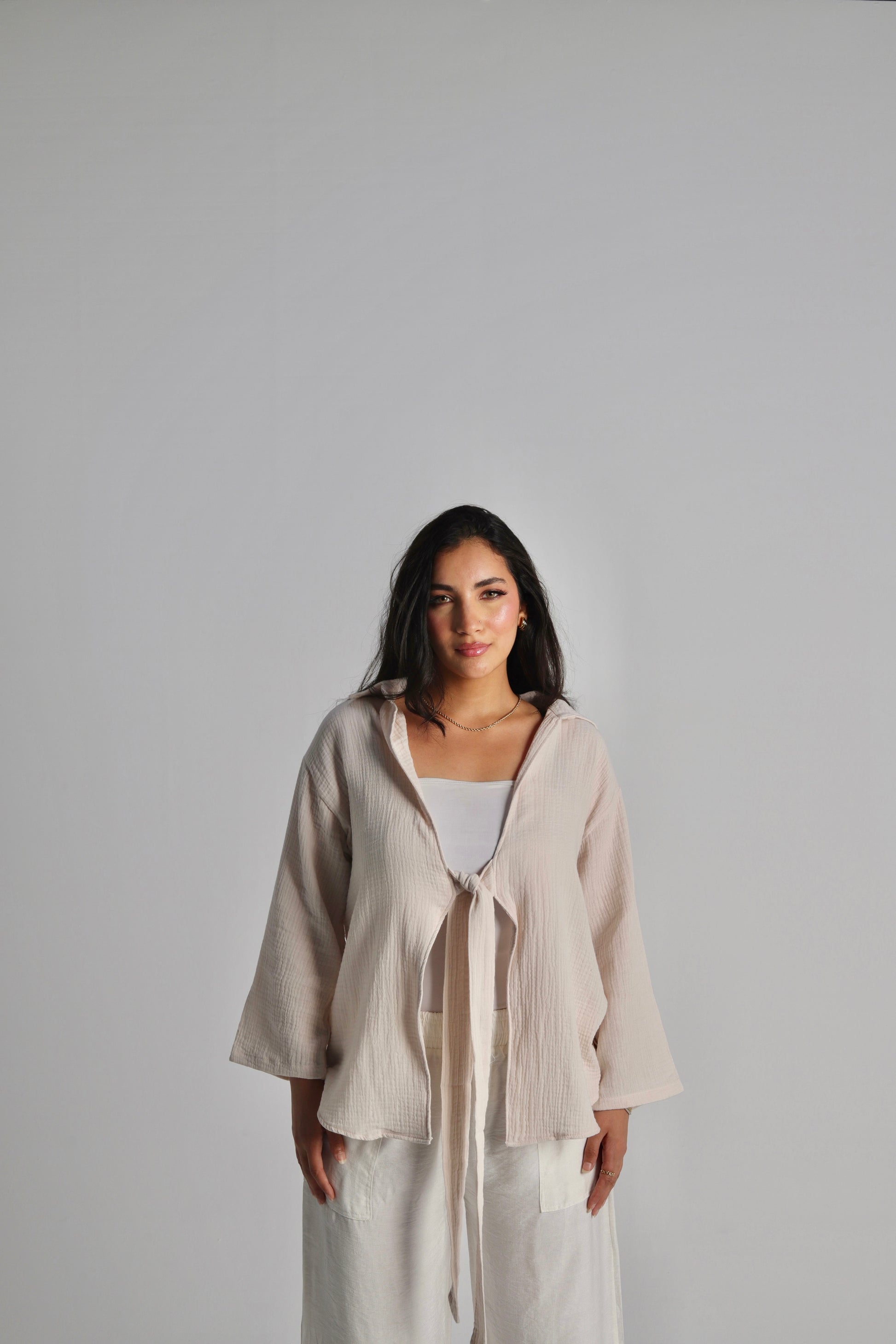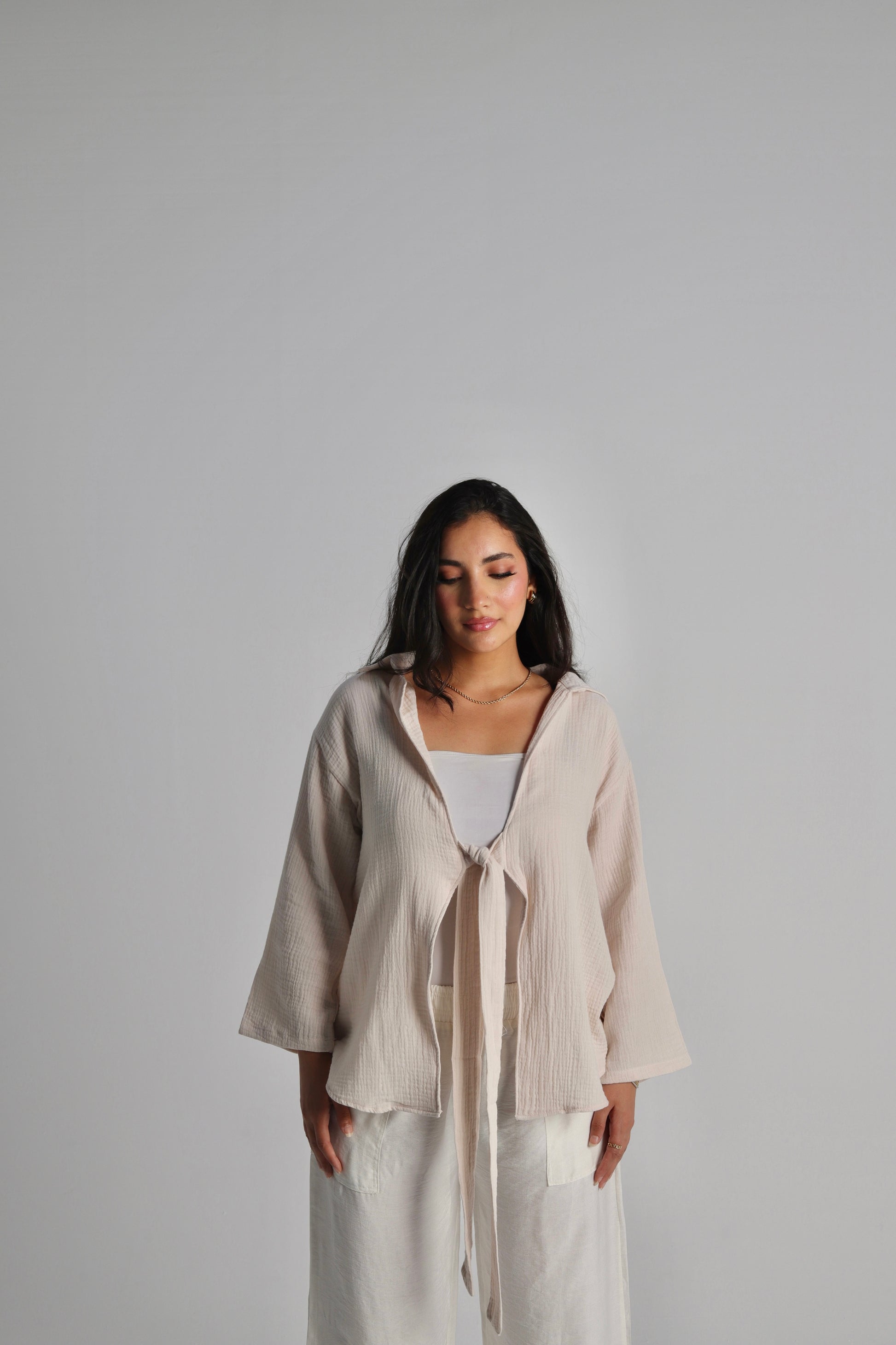 Creamy tie shirt in soft beige Luxury Crinkle fabric with a flattering tie-front and relaxed silhouette for effortless style.