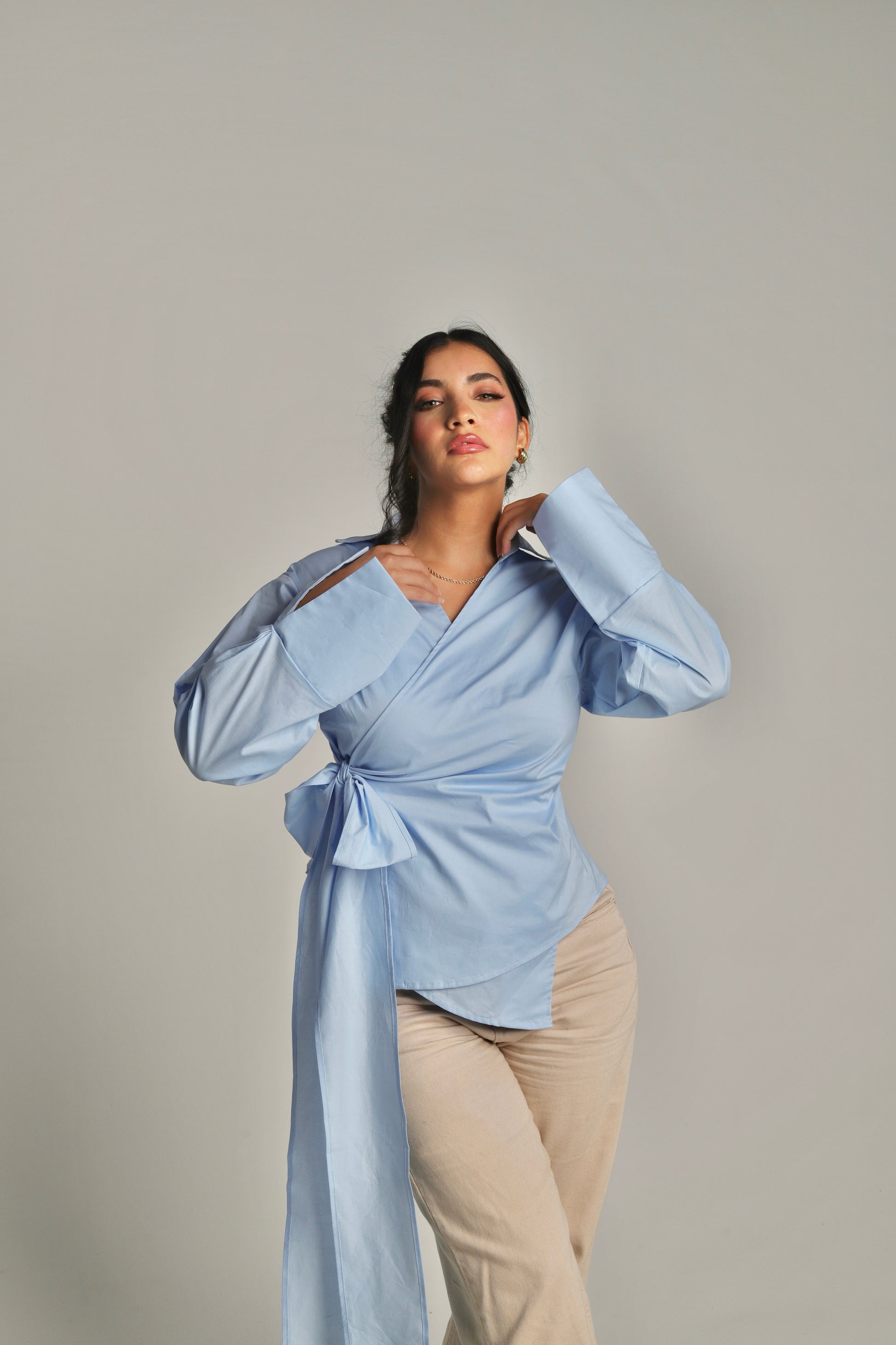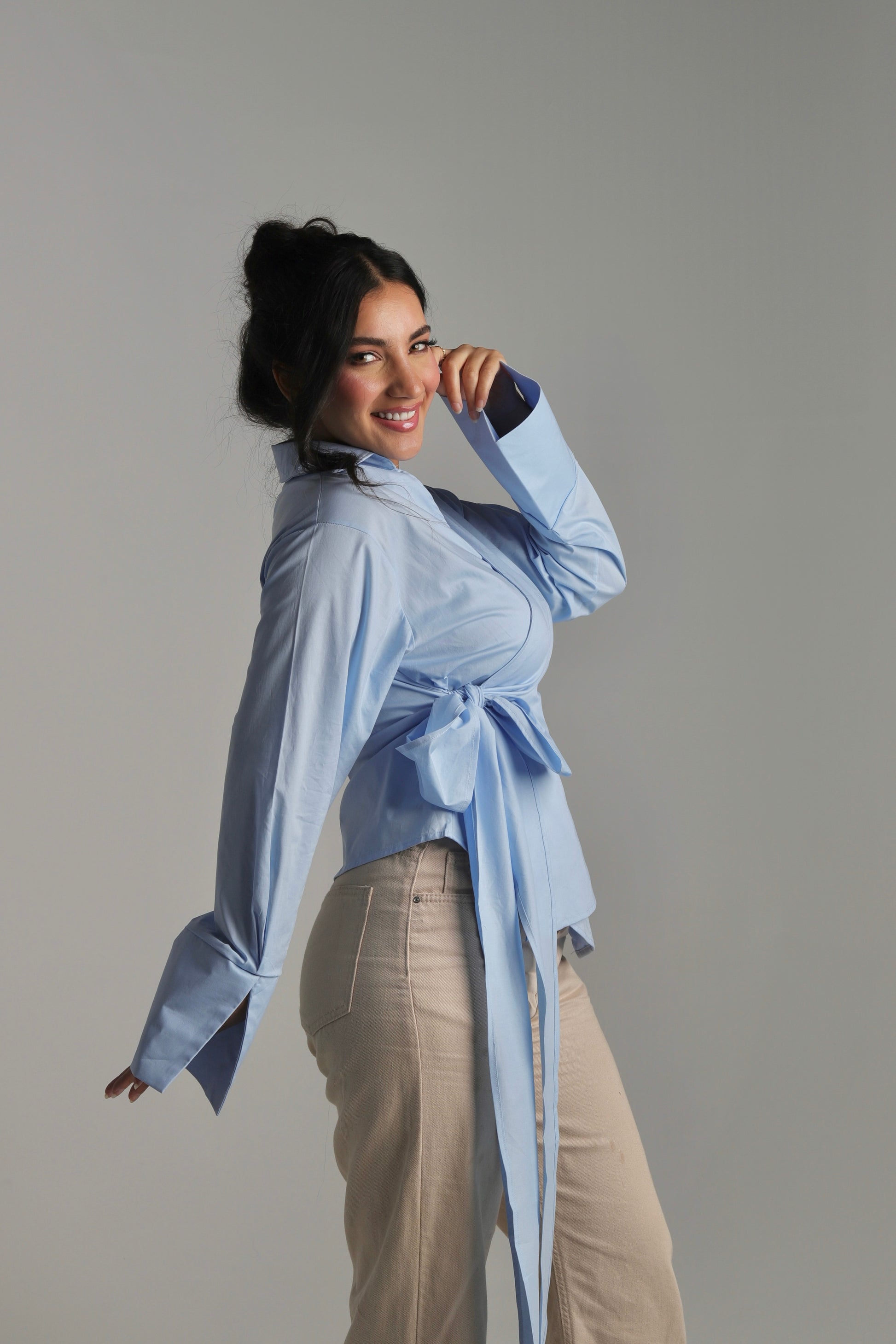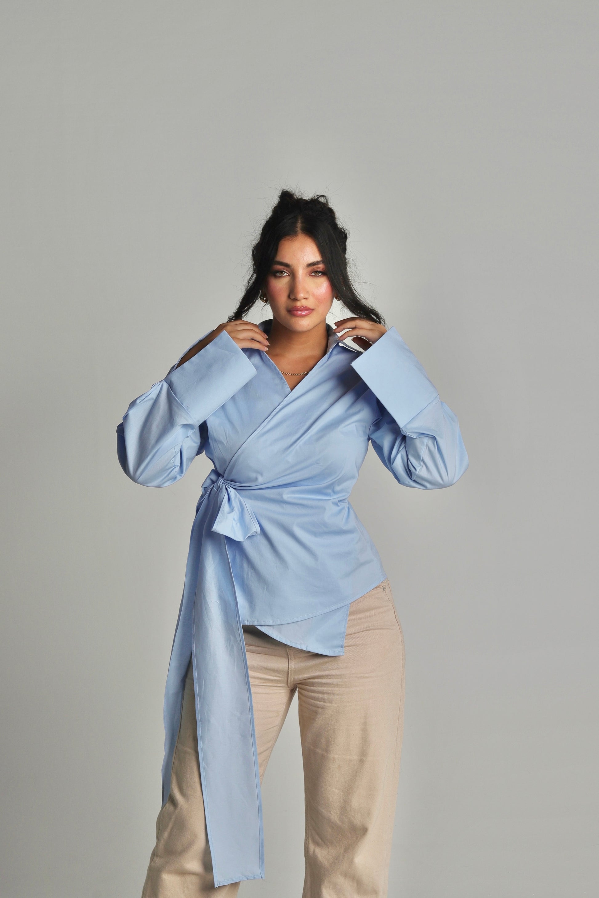 Sky–lene wrap shirt in dreamy baby blue, crafted from premium poplin cotton with a classic collar, wide cuffs, and a versatile waist tie. Effortless and elegant.
